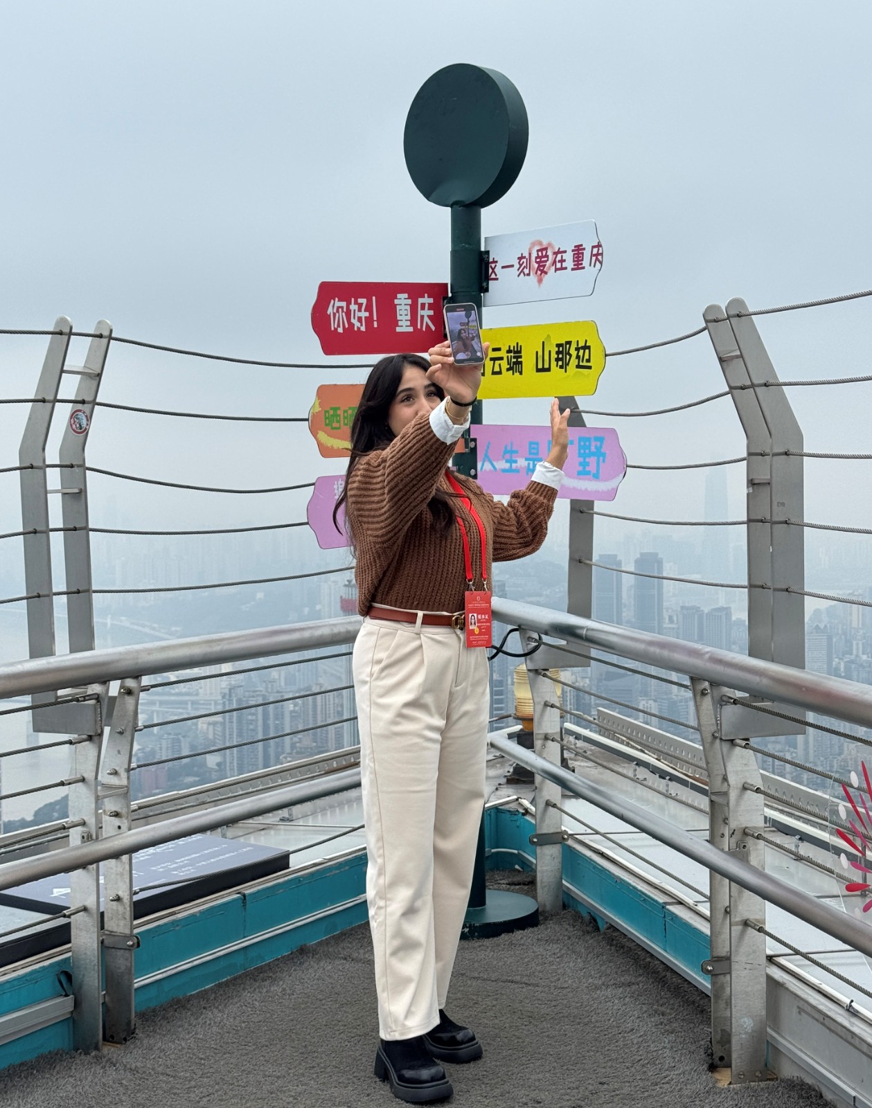當(dāng)日下午,中阿記者代表團抵達(dá)位于渝中半島核心區(qū)的 WFC 觀景臺,在 75 層露天觀景區(qū)開啟了高空探秘之旅。這座海拔 590 米、建筑高度 339 米的觀景平臺可以360° 無遮擋視野可將長江、嘉陵江交匯盛景與十七座跨江大橋盡收眼底。對于多數(shù)首次到訪重慶的阿拉伯國家記者而言,高低錯落的立體城市格局帶來強烈視覺沖擊,他們紛紛舉起相機、手機拍攝打卡,并不時向工作人員詢問城市建設(shè)細(xì)節(jié),直言 “被這種山水與城市共生的獨特風(fēng)貌深深吸引”。