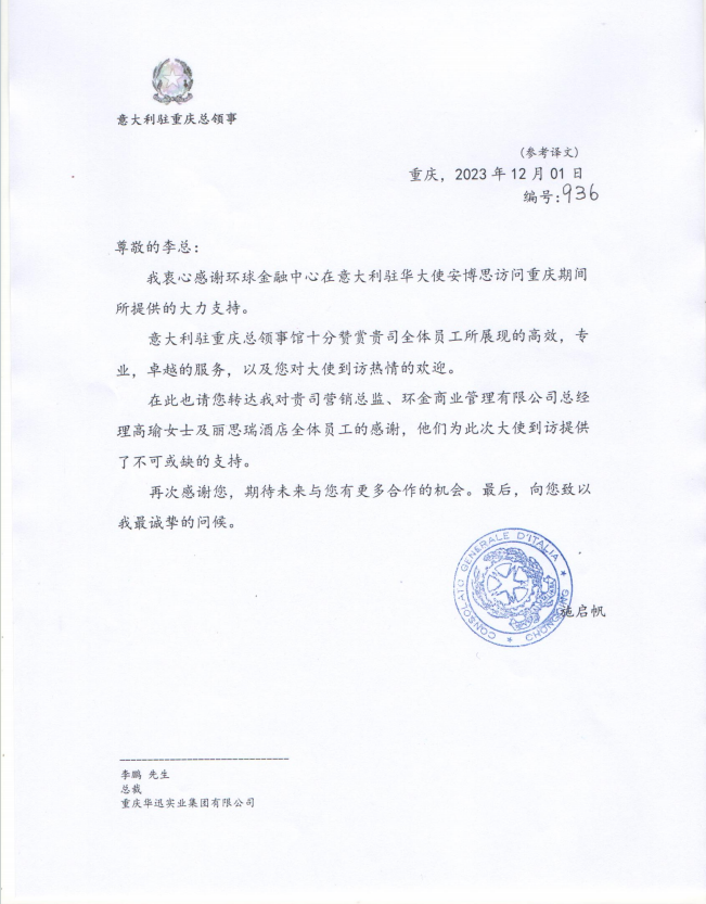 意大利駐重慶總領(lǐng)事館總領(lǐng)事向集團(tuán)發(fā)來感謝信