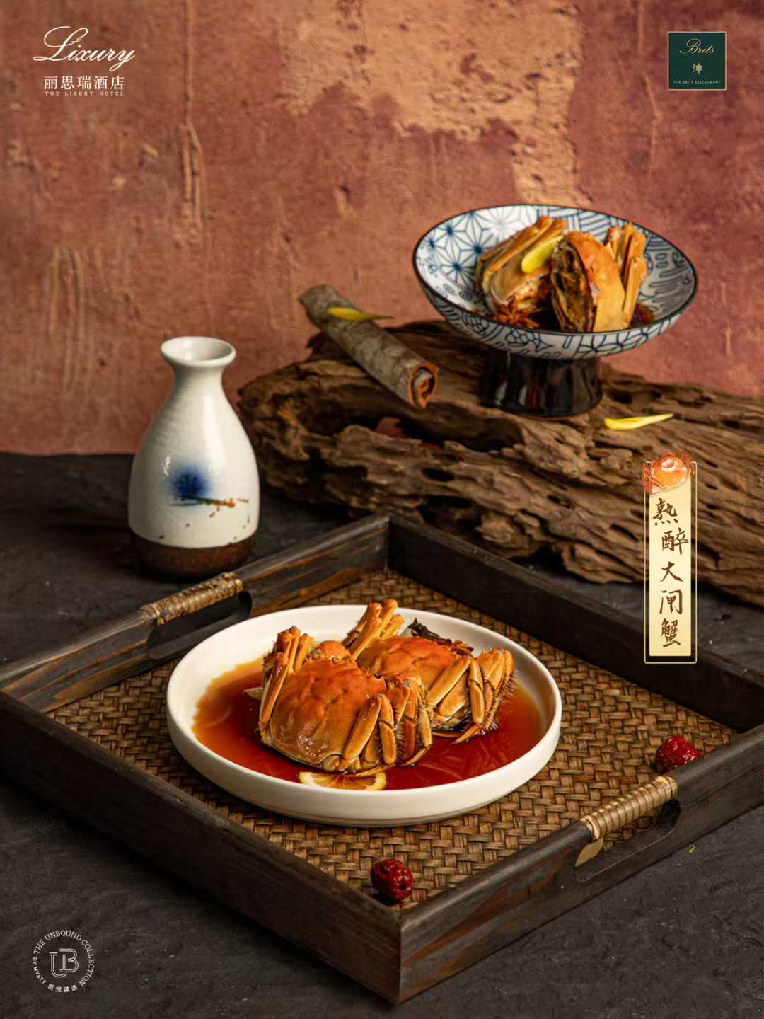 熟醉大閘蟹用伏特加花雕酒與二十余味香料精心浸釀,琥珀色的蟹殼內(nèi)蘊藏著酒香回蕩的溫柔。微醺的甘醇滲透每絲蟹肉,冰涼口感與馥郁酒香在味蕾綻放出詩意悠長。