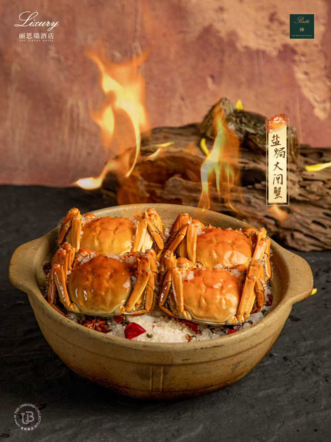 鹽焗大閘蟹 (臻選限量派送母蟹約2.5兩)粗糲鹽粒賦予蟹殼淡淡焦香,將鮮汁牢牢封存。輕輕掰開,咸香裹挾著海洋的氣息,緊實蟹肉在唇齒間層次分明。