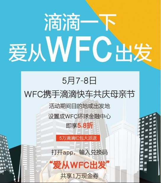 起/終點(diǎn)設(shè)置為【W(wǎng)FC環(huán)球金融中心】即可自動(dòng)立享5.8折出行優(yōu)惠(每天限量1000程,手快有手慢無(wú))
