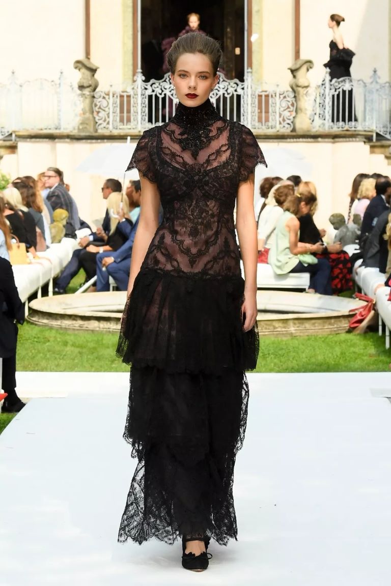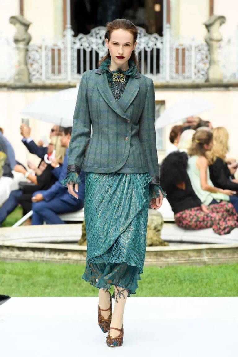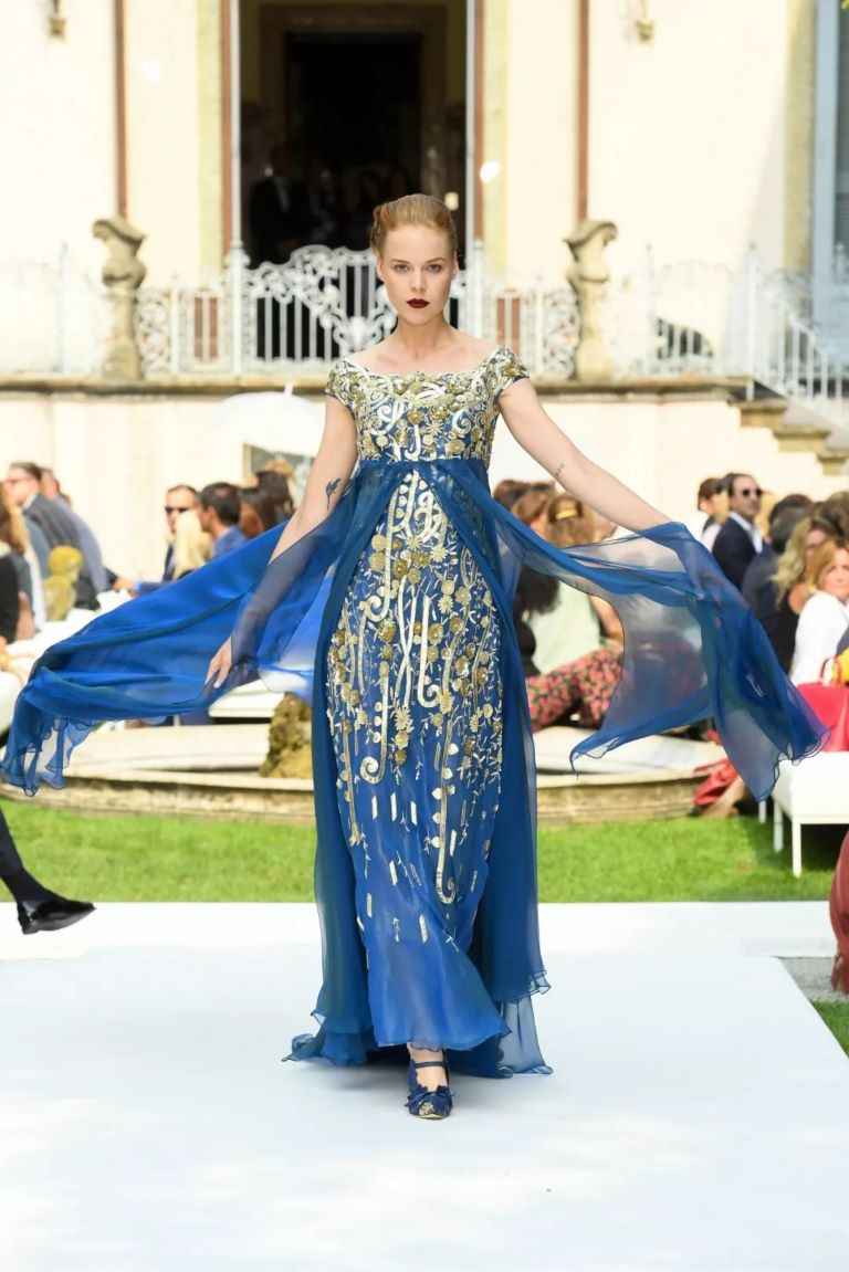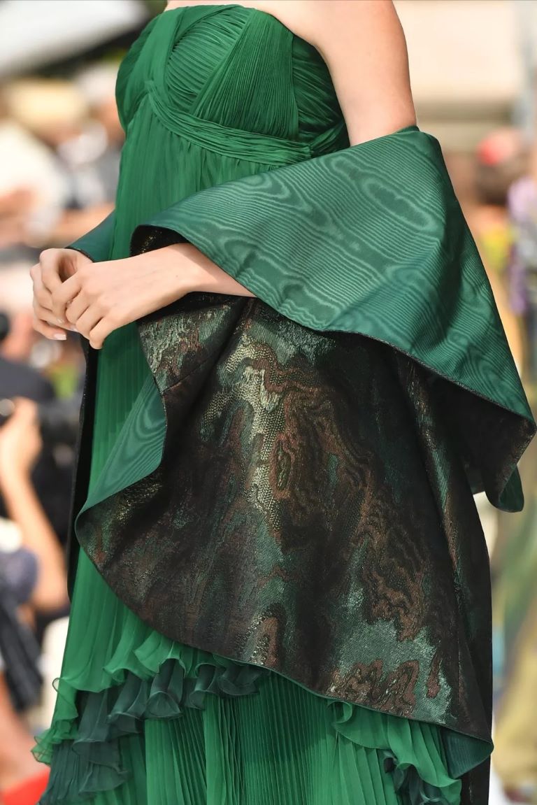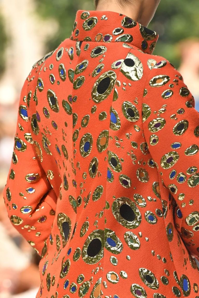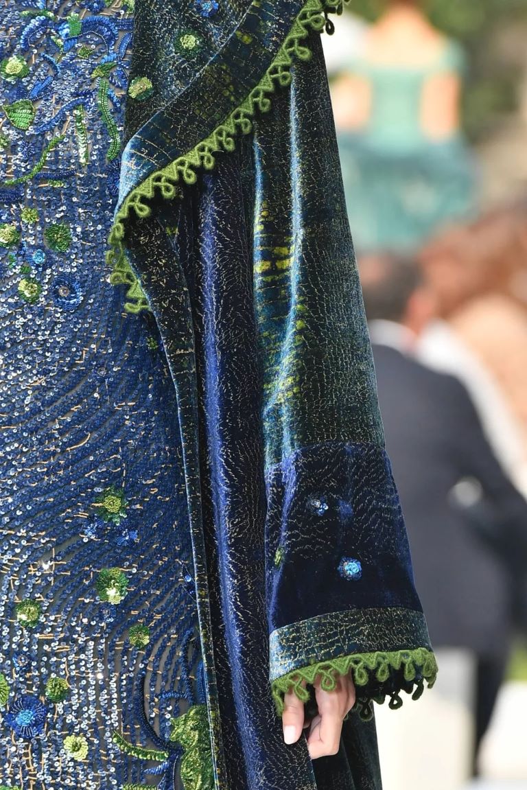 克林姆特在創(chuàng)作中期吸收了拜占庭鑲嵌畫和東歐民族的裝飾藝術(shù)的營養(yǎng),致使他的畫具有“鑲嵌風(fēng)格”。 所以本次高定系列處處可以看到鑲嵌畫和東歐裝飾藝術(shù)的影響。一件用涂鴉鉆石裝飾的大麥花呢小外套是最能致敬克林姆特的象征物件,星空以及水基綠和阿特西島夏日夜晚的深藍(lán)色交匯成的交響樂章像一首詩,被緊身衣上最細(xì)小的亮片和同色系天鵝絨大衣詮釋出來。皮革和發(fā)光的金色掐絲交織在一起,縫在層層淺藍(lán)色雪紡上。本次高定系列中,有許多古色古香的珍貴織物,波紋狀的表面,鑲嵌的紐扣和胸針,金屬元素和石頭的應(yīng)用,這些是奢華、狂野和鮮活生動(dòng)的細(xì)節(jié),透明感和豐富性圍繞著身體,在自相矛盾中尋求一種有如煉金術(shù)般的和諧狀態(tài)。