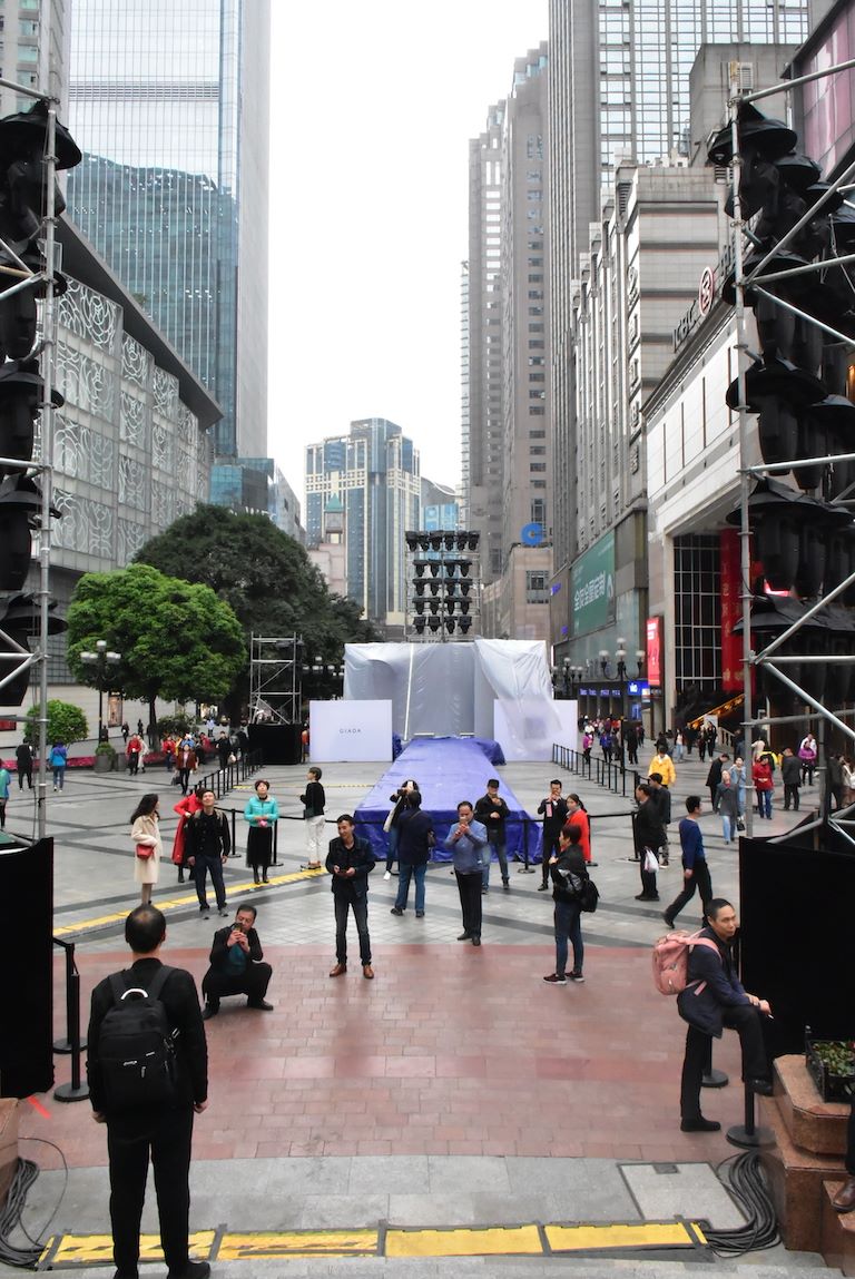 在解放碑碑體中心旁,本次秀場的場地搭建已現(xiàn)雛形,周圍已經(jīng)圍聚些許市民在周圍圍觀拍照?!氨敬位顒拥男銓?dǎo)團隊已于3月17日抵達重慶,走秀的模特也已與3月20日陸續(xù)抵達,現(xiàn)正在緊張排練中。最近幾天我們已經(jīng)協(xié)助秀導(dǎo)團隊先后完成了場地的報批、安保手續(xù),屆時會有100名安保人員及公安干警在周圍負責(zé)安保警戒任務(wù)。此外,我們聯(lián)合秀導(dǎo)團隊先后走訪了解放碑附近的英利國際、新華國際等大廈,現(xiàn)已確定了附近的若干個拍攝機位,屆時將會在解放碑中央的6塊大屏和WFC燈幕配合向重慶直播,力求將大秀最好的一面禮獻重慶。”商業(yè)公司市場部經(jīng)理說道。